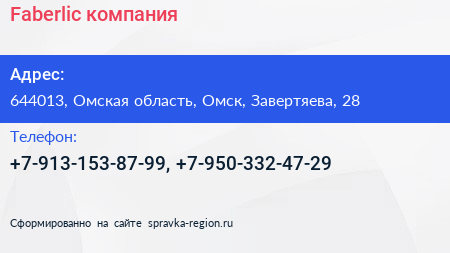 Faberlic, компания по адресу 644013, Омская область, Омск, Завертяева, 28 в дальнейшем Организация, размещена в следующих категориях: