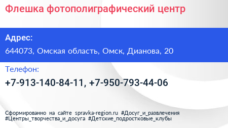 Флешка, фотополиграфический центр по адресу 644073, Омская область, Омск, Дианова, 20 в дальнейшем Организация, размещена в следующих категориях: