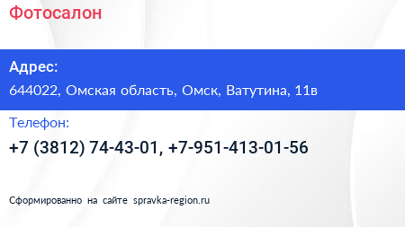 Фотосалон по адресу 644022, Омская область, Омск, Ватутина, 11в в дальнейшем Организация, размещена в следующих категориях: