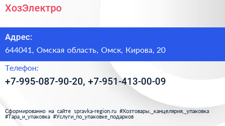 ХозЭлектро по адресу 644041, Омская область, Омск, Кирова, 20 в дальнейшем Организация, размещена в следующих категориях: