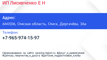 ИП Лисивченко Е.Н. по адресу 644106, Омская область, Омск, Дергачёва, 36а в дальнейшем Организация, размещена в следующих категориях: