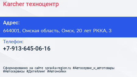 Karcher, техноцентр по адресу 644001, Омская область, Омск, 20 лет РККА, 3 в дальнейшем Организация, размещена в следующих категориях: