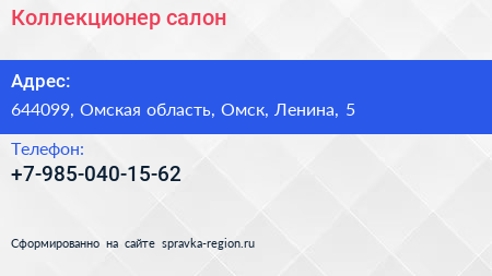 Коллекционер, салон по адресу 644099, Омская область, Омск, Ленина, 5 в дальнейшем Организация, размещена в следующих категориях: