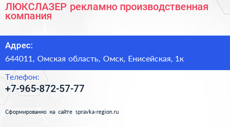 ЛЮКСЛАЗЕР, рекламно-производственная компания по адресу 644011, Омская область, Омск, Енисейская, 1к в дальнейшем Организация, размещена в следующих категориях: