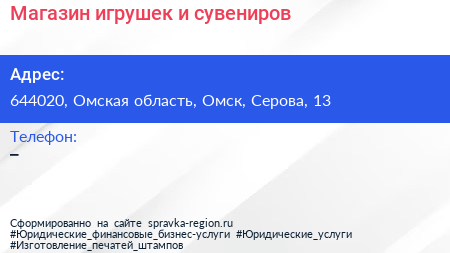 Магазин игрушек и сувениров по адресу 644020, Омская область, Омск, Серова, 13 в дальнейшем Организация, размещена в следующих категориях: