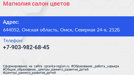 Магнолия, салон цветов по адресу 644052, Омская область, Омск, Северная 24-я, 212Б в дальнейшем Организация, размещена в следующих категориях: