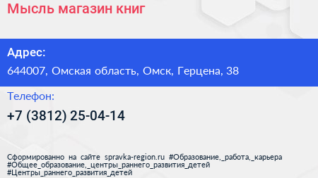 Мысль, магазин книг по адресу 644007, Омская область, Омск, Герцена, 38 в дальнейшем Организация, размещена в следующих категориях: