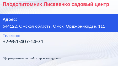 Плодопитомник Лисавенко, садовый центр по адресу 644122, Омская область, Омск, Орджоникидзе, 111 в дальнейшем Организация, размещена в следующих категориях:
