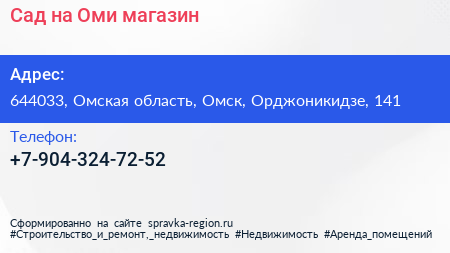 Сад на Оми, магазин по адресу 644033, Омская область, Омск, Орджоникидзе, 141 в дальнейшем Организация, размещена в следующих категориях:
