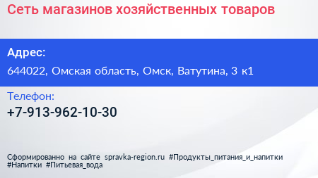 Сеть магазинов хозяйственных товаров по адресу 644022, Омская область, Омск, Ватутина, 3 к1 в дальнейшем Организация, размещена в следующих категориях:
