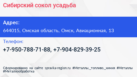 Сибирский сокол, усадьба по адресу 644015, Омская область, Омск, Авиационная, 13 в дальнейшем Организация, размещена в следующих категориях: