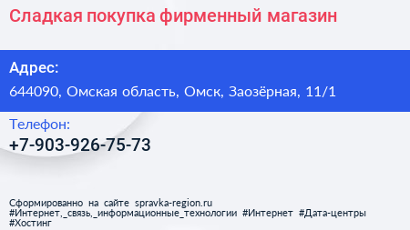 Сладкая покупка, фирменный магазин по адресу 644090, Омская область, Омск, Заозёрная, 11/1 в дальнейшем Организация, размещена в следующих категориях: