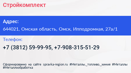 Стройкомплект по адресу 644021, Омская область, Омск, Ипподромная, 27а/1 в дальнейшем Организация, размещена в следующих категориях: