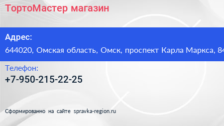 ТортоМастер, магазин по адресу 644020, Омская область, Омск, проспект Карла Маркса, 84 в дальнейшем Организация, размещена в следующих категориях: