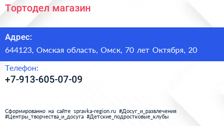 Тортодел, магазин по адресу 644123, Омская область, Омск, 70 лет Октября, 20 в дальнейшем Организация, размещена в следующих категориях: