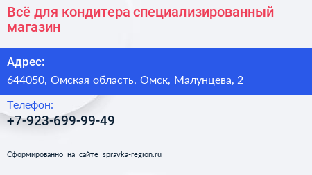 Всё для кондитера, специализированный магазин по адресу 644050, Омская область, Омск, Малунцева, 2 в дальнейшем Организация, размещена в следующих категориях: