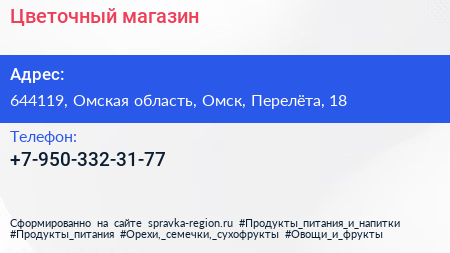 Цветочный магазин по адресу 644119, Омская область, Омск, Перелёта, 18 в дальнейшем Организация, размещена в следующих категориях:
