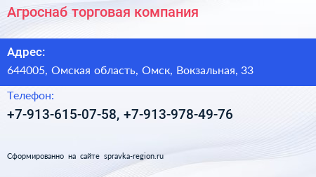 Агроснаб, торговая компания по адресу 644005, Омская область, Омск, Вокзальная, 33 в дальнейшем Организация, размещена в следующих категориях: