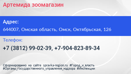Артемида, зоомагазин по адресу 644007, Омская область, Омск, Октябрьская, 126 в дальнейшем Организация, размещена в следующих категориях: