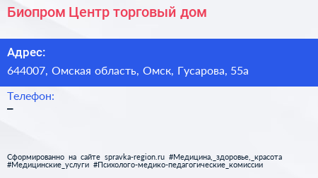 Биопром-Центр, торговый дом по адресу 644007, Омская область, Омск, Гусарова, 55а в дальнейшем Организация, размещена в следующих категориях: