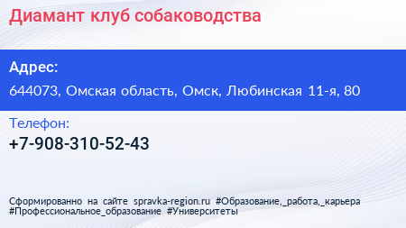 Диамант, клуб собаководства по адресу 644073, Омская область, Омск, Любинская 11-я, 80 в дальнейшем Организация, размещена в следующих категориях: