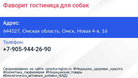Фаворит, гостиница для собак по адресу 644527, Омская область, Омск, Новая 4-я, 16 в дальнейшем Организация, размещена в следующих категориях: