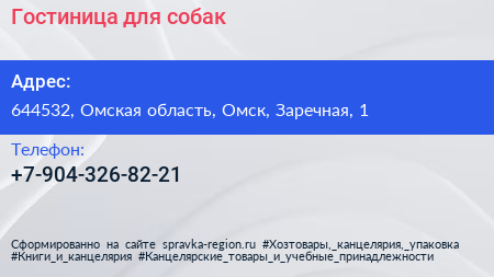 Гостиница для собак по адресу 644532, Омская область, Омск, Заречная, 1 в дальнейшем Организация, размещена в следующих категориях:
