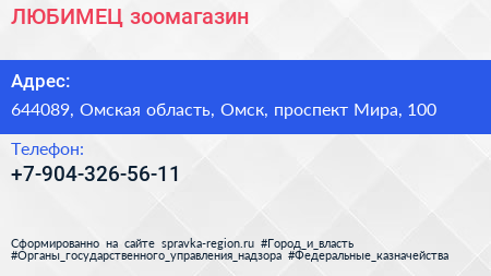 ЛЮБИМЕЦ, зоомагазин по адресу 644089, Омская область, Омск, проспект Мира, 100 в дальнейшем Организация, размещена в следующих категориях: