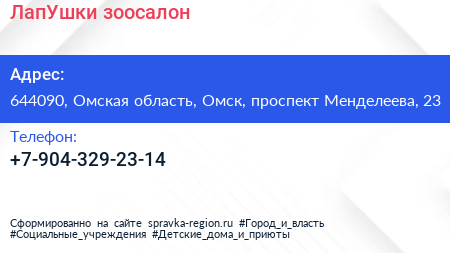 ЛапУшки, зоосалон по адресу 644090, Омская область, Омск, проспект Менделеева, 23 в дальнейшем Организация, размещена в следующих категориях:
