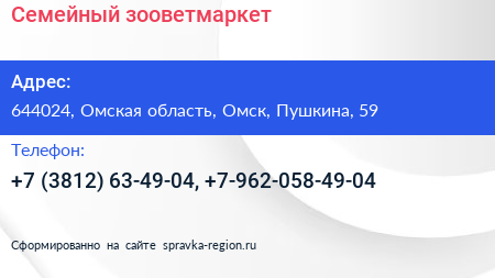 Семейный, зооветмаркет по адресу 644024, Омская область, Омск, Пушкина, 59 в дальнейшем Организация, размещена в следующих категориях: