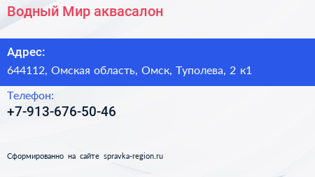 Водный Мир, аквасалон по адресу 644112, Омская область, Омск, Туполева, 2 к1 в дальнейшем Организация, размещена в следующих категориях: