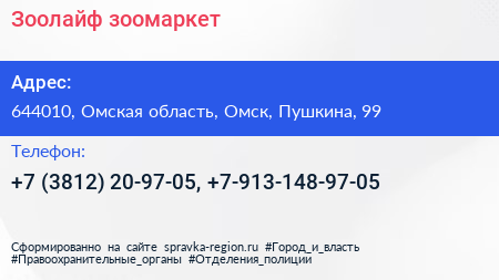 Зоолайф, зоомаркет по адресу 644010, Омская область, Омск, Пушкина, 99 в дальнейшем Организация, размещена в следующих категориях:
