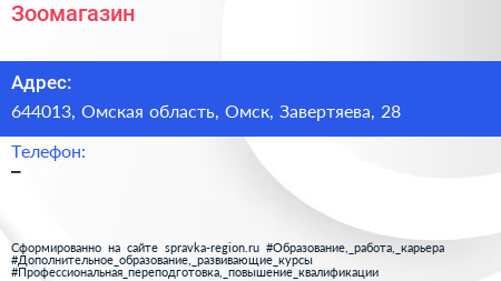 Зоомагазин по адресу 644013, Омская область, Омск, Завертяева, 28 в дальнейшем Организация, размещена в следующих категориях: