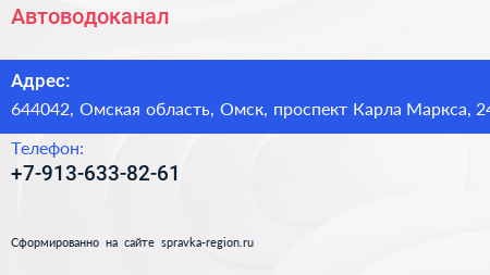 Автоводоканал по адресу 644042, Омская область, Омск, проспект Карла Маркса, 24 в дальнейшем Организация, размещена в следующих категориях: