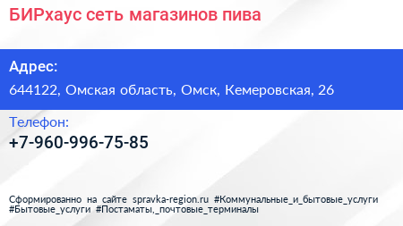 БИРхаус, сеть магазинов пива по адресу 644122, Омская область, Омск, Кемеровская, 26 в дальнейшем Организация, размещена в следующих категориях:
