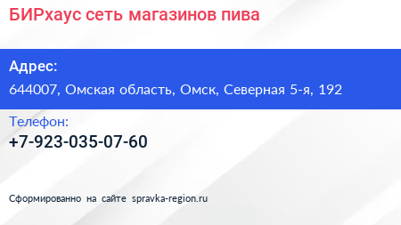 БИРхаус, сеть магазинов пива по адресу 644007, Омская область, Омск, Северная 5-я, 192 в дальнейшем Организация, размещена в следующих категориях: