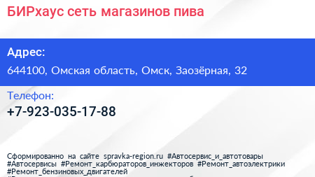 БИРхаус, сеть магазинов пива по адресу 644100, Омская область, Омск, Заозёрная, 32 в дальнейшем Организация, размещена в следующих категориях: