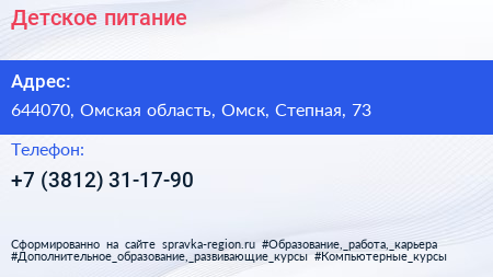 Детское питание по адресу 644070, Омская область, Омск, Степная, 73 в дальнейшем Организация, размещена в следующих категориях: