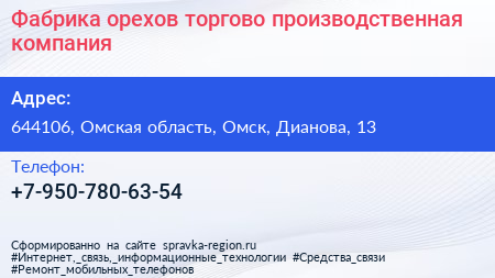 Фабрика орехов, торгово-производственная компания по адресу 644106, Омская область, Омск, Дианова, 13 в дальнейшем Организация, размещена в следующих категориях: