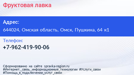 Фруктовая лавка по адресу 644024, Омская область, Омск, Пушкина, 64 к1 в дальнейшем Организация, размещена в следующих категориях:
