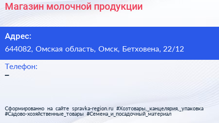 Магазин молочной продукции по адресу 644082, Омская область, Омск, Бетховена, 22/12 в дальнейшем Организация, размещена в следующих категориях: