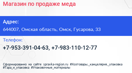 Магазин по продаже меда по адресу 644007, Омская область, Омск, Гусарова, 33 в дальнейшем Организация, размещена в следующих категориях: