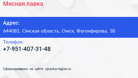 Мясная лавка по адресу 644081, Омская область, Омск, Фугенфирова, 3Б в дальнейшем Организация, размещена в следующих категориях: