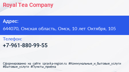 Royal Tea Company по адресу 644070, Омская область, Омск, 10 лет Октября, 105 в дальнейшем Организация, размещена в следующих категориях: