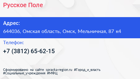 Русское Поле по адресу 644036, Омская область, Омск, Мельничная, 87 к4 в дальнейшем Организация, размещена в следующих категориях: