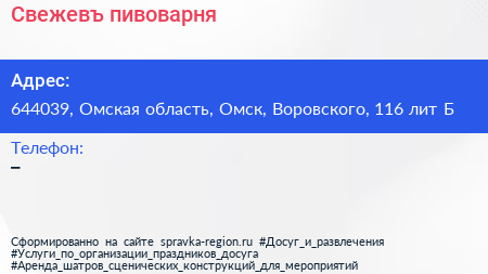 Свежевъ, пивоварня по адресу 644039, Омская область, Омск, Воровского, 116 лит Б в дальнейшем Организация, размещена в следующих категориях: