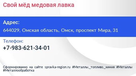 Свой мёд, медовая лавка по адресу 644029, Омская область, Омск, проспект Мира, 31 в дальнейшем Организация, размещена в следующих категориях: