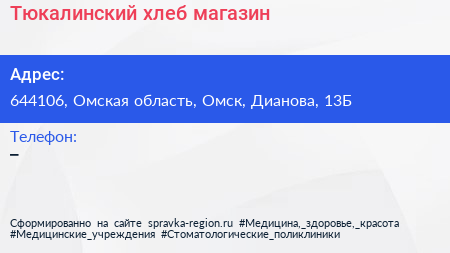 Тюкалинский хлеб, магазин по адресу 644106, Омская область, Омск, Дианова, 13Б в дальнейшем Организация, размещена в следующих категориях:
