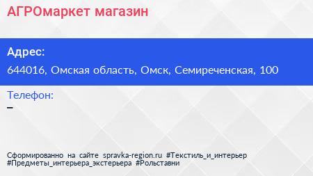 АГРОмаркет, магазин по адресу 644016, Омская область, Омск, Семиреченская, 100 в дальнейшем Организация, размещена в следующих категориях: