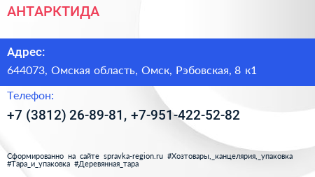 АНТАРКТИДА по адресу 644073, Омская область, Омск, Рэбовская, 8 к1 в дальнейшем Организация, размещена в следующих категориях: